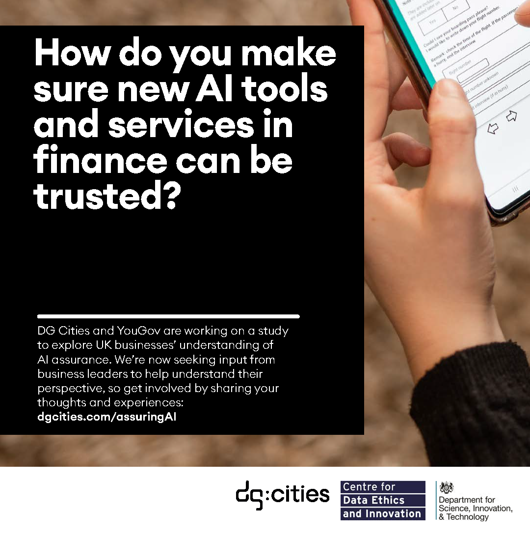 DG Cities and YouGov are partnering to explore the UK’s banking and financial services sectors’ understanding of (artificial intelligence) AI assurance. This study is being undertaken by DG Cities for the Centre for Data Ethics and Innovation, part of the Department for Science, Innovation, and Technology. We’re now seeking input from professionals working on AI in finance and banking to understand AI assurance of banking AI.