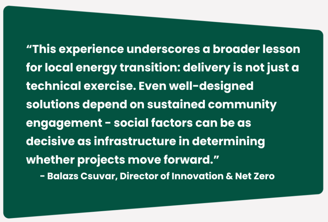 However, this work in particular highlighted how the challenge extends beyond installing renewable tech. It showed the need for viable local energy systems to fully address governance, billing and resident participation, as although initial interest was clear, uptake fell short of the threshold required to proceed.